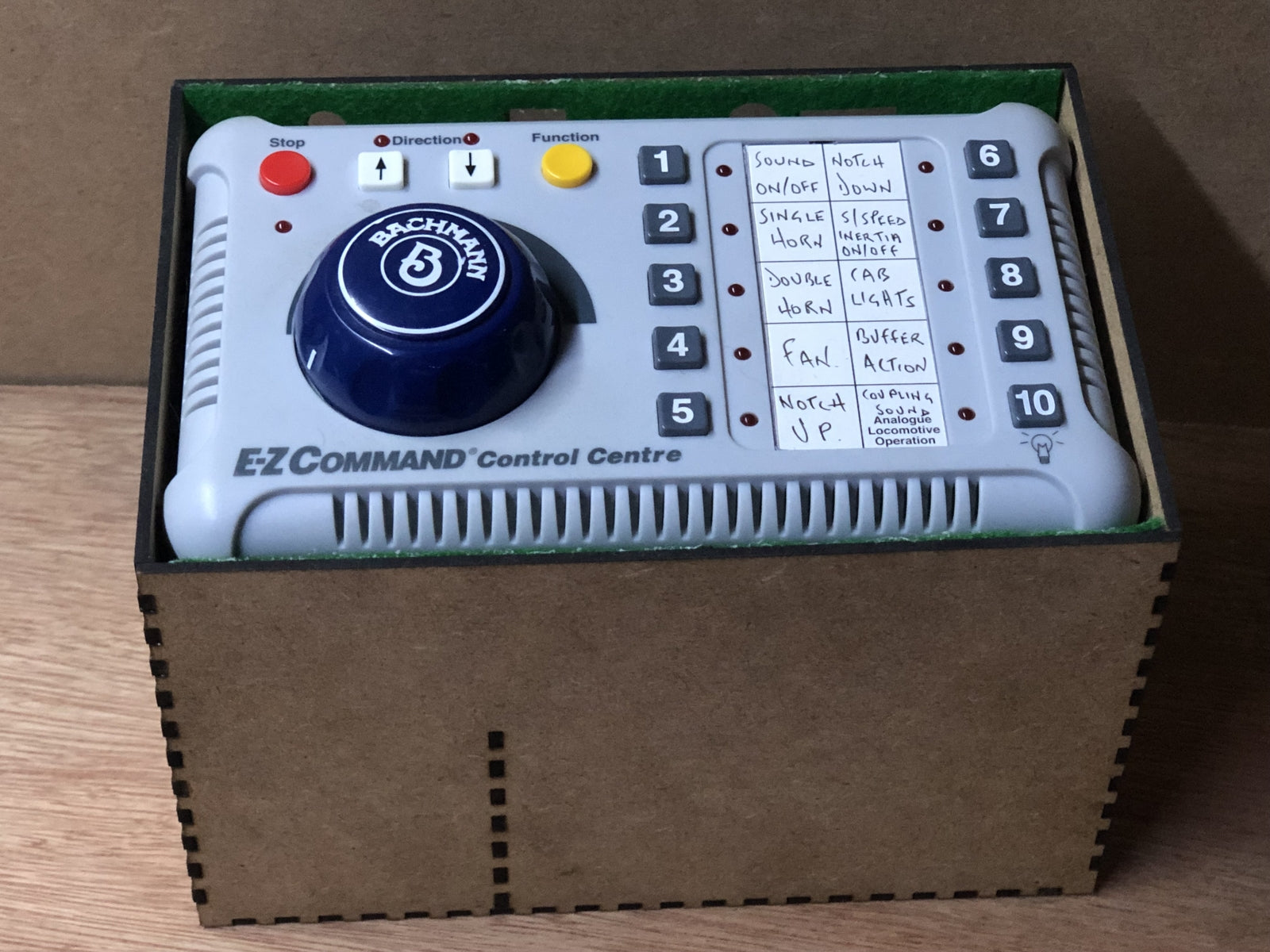The kit comes as a flat packed precision laser cut unit and can be put together in under 15 minutes with just a little wood glue, use any of the main white glue brands. Other Bachman DCC Controllers will also probably fit where they have the same case design. It comes with a precision cut green felt backing to provide both a snug and soft fit for the controller with all the cutouts in place.